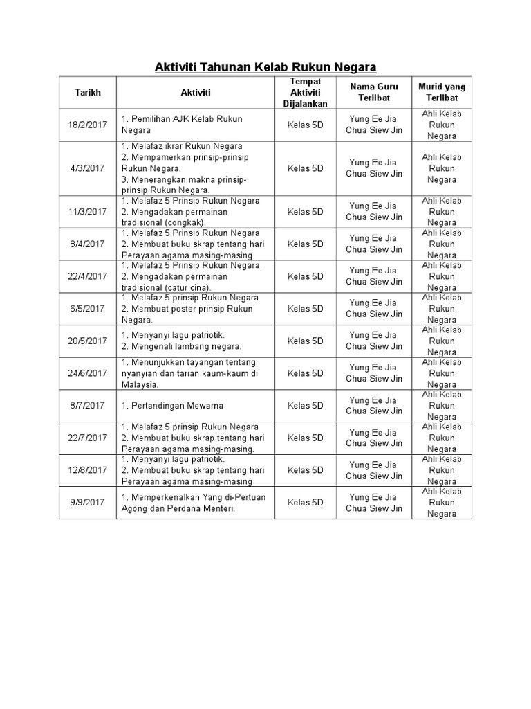 Aktiviti Kelab Rukun Negara Sk Leban Chondong Youtube. RANCANGAN AKTIVITI TAHUNAN KELAB RUKUNEGARA 2018 Perjumpaan TopikProgram Objektif Aktiviti AlatBahanCatatan 1 Suaikenal guru Pada akhir per- 1. Kertas Kerja Kelab Rukun Negara.
