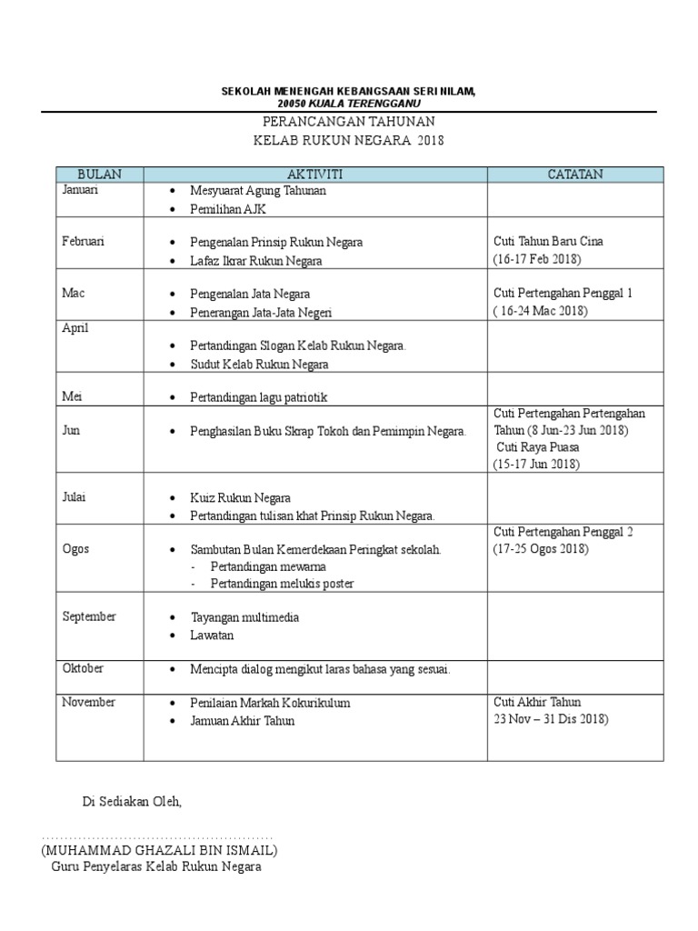 Doc Rancangan Aktiviti Tahunan Kelab Rukunegara 2018 Norhaini Nadi Academia Edu
