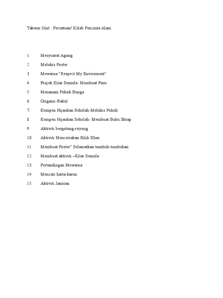 Aktiviti Kelab Bahasa Melayu Secara Online aktivitisenang. RANCANGAN TAHUNAN KELAB PALS 2017 BIL. Di samping memberi keselesaan kepada manusia ia juga sedikit sebanyak akan menjejaskan aktiviti-aktiviti pembangunan negara sekiranya alam sekitar di negara kita tidak dijaga dengan.