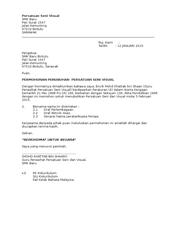 Akta ini daripada segala atau mana-mana jua daripada peruntukan- peruntukan Akta ini. Alamat Sekolah Kebangsaan Bubul 91308 Semporna Sabah. Langkah 2 Tulis Surat Permohonan penubuhan dari Guru penasihat kepada PENDAFTAR Pengetua Langkah 3 Terima Surat Kelulusan Penubuhan dari Pendaftar Pengetua Terima Surat Perlantikan dari PENGETUA kepada Guru Penasihat Langkah 4.