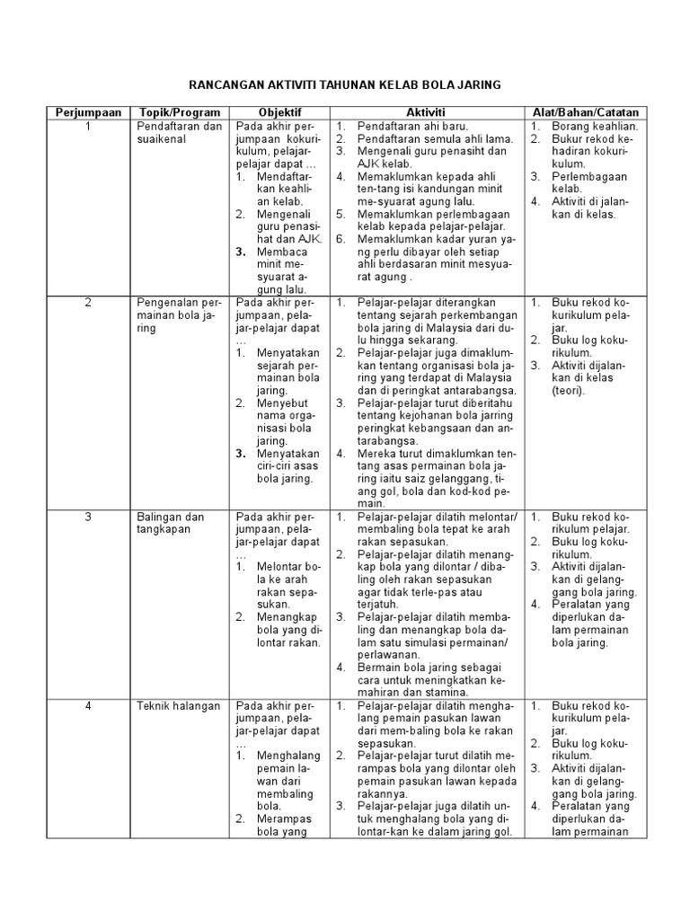 Rancangan Aktiviti Tahunan Kelab Bola Jaring Pdf