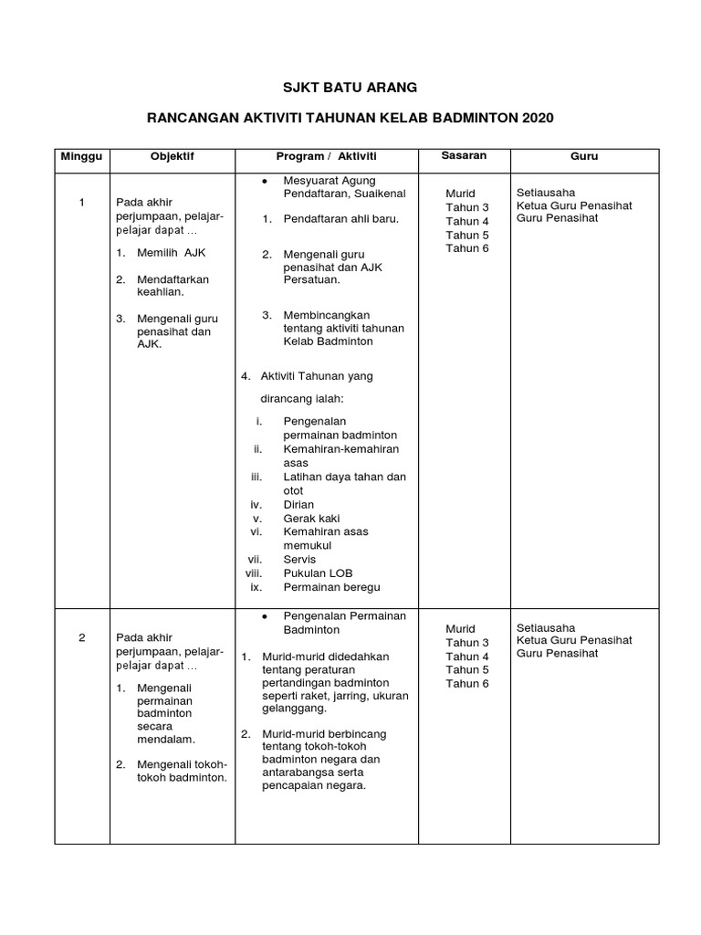 Rancangan Tahunan Kelab Badminton 2020 Pdf