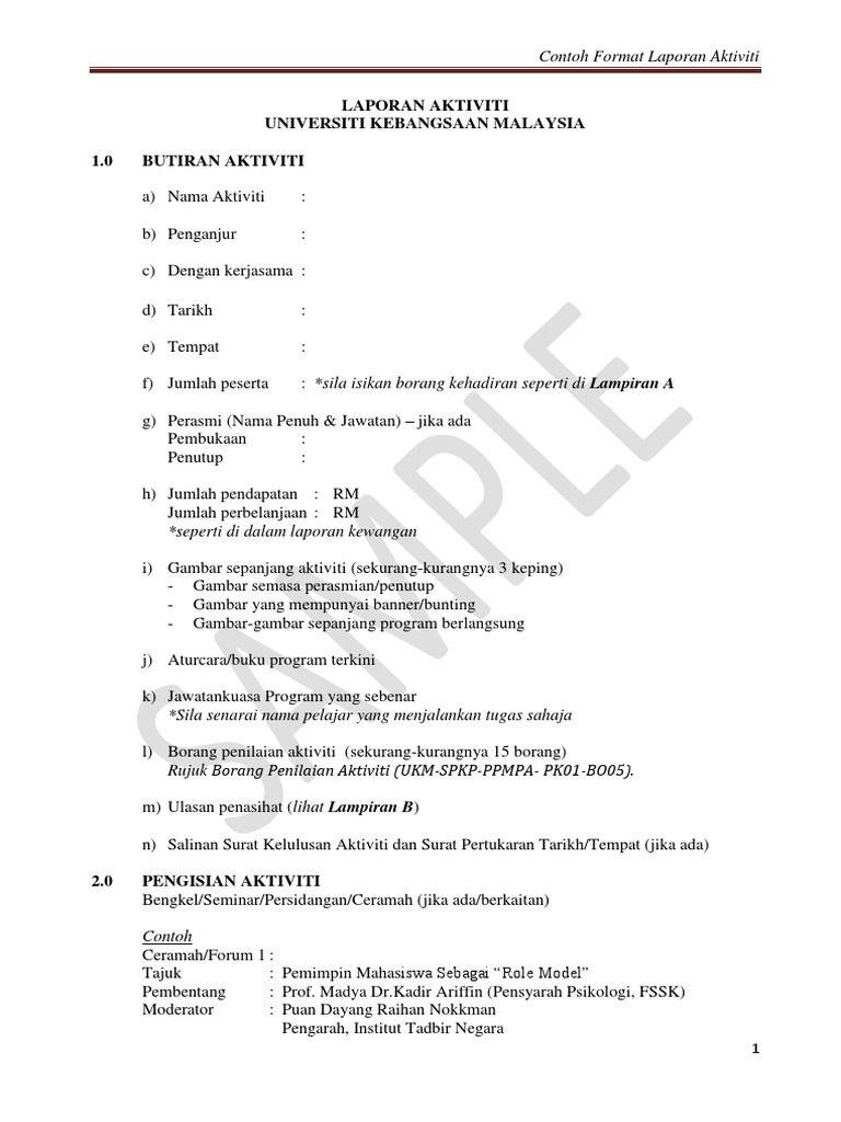 Format Laporan Aktiviti PersatuanKelab Pelajar CONTOH LAMPIRAN A SENARAI KEHADIRAN PESERTA Nama Program. LAPORAN AKTIVITI MINGGUAN KELAB KOMPUTER 2015 TARIKH HARI TEMPAT GURU PENASIHAT BIL NAMA GURU TTGN KEHADIRAN TAHUN LELAKI PEREMPUAN JUMLAH 4 5 6 JUMLAH KEHADIRAN LAPORAN AKTIVITI HAL-HAL LAIN Dicatat oleh. Contoh Format Laporan Aktiviti LAPORAN AKTIVITI UNIVERSITI KEBANGSAAN MALAYSIA 10 BUTIRAN AKTIVITI a Nama Aktiviti.