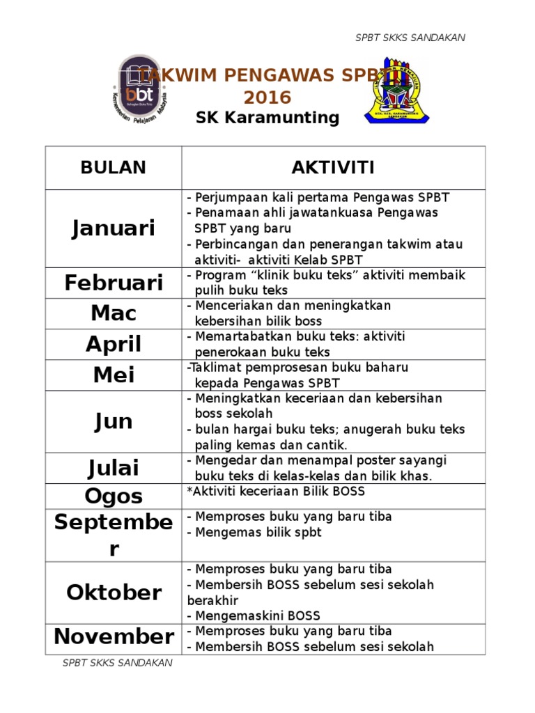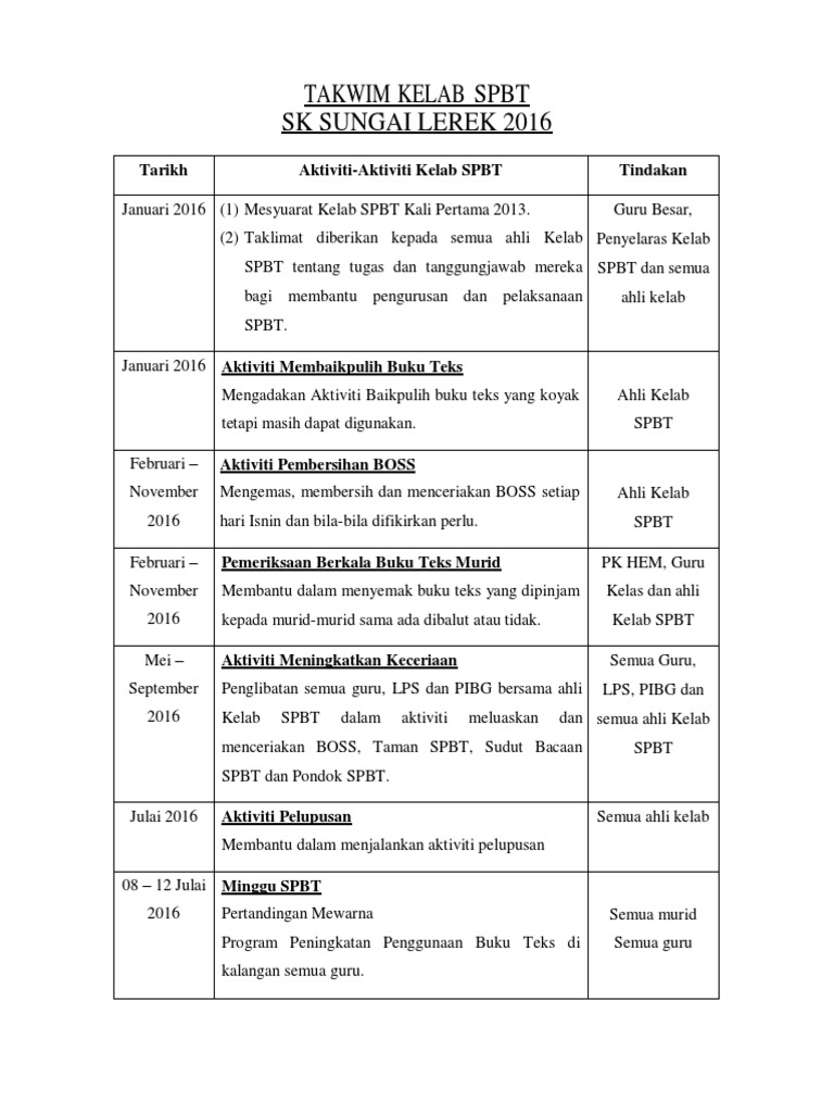 85 views November 23 2019. Memperkemas menyusun aktiviti dan meletakkan Kelab SPBT setaraf dengan kelab-kelab lain di sekolah. Februari - Agihan dalam daerah antara daerah Lelong Buku Teks SPBT - Menyediakan senarai murid yang layak dan tidak layak bagi tahun akan datang.