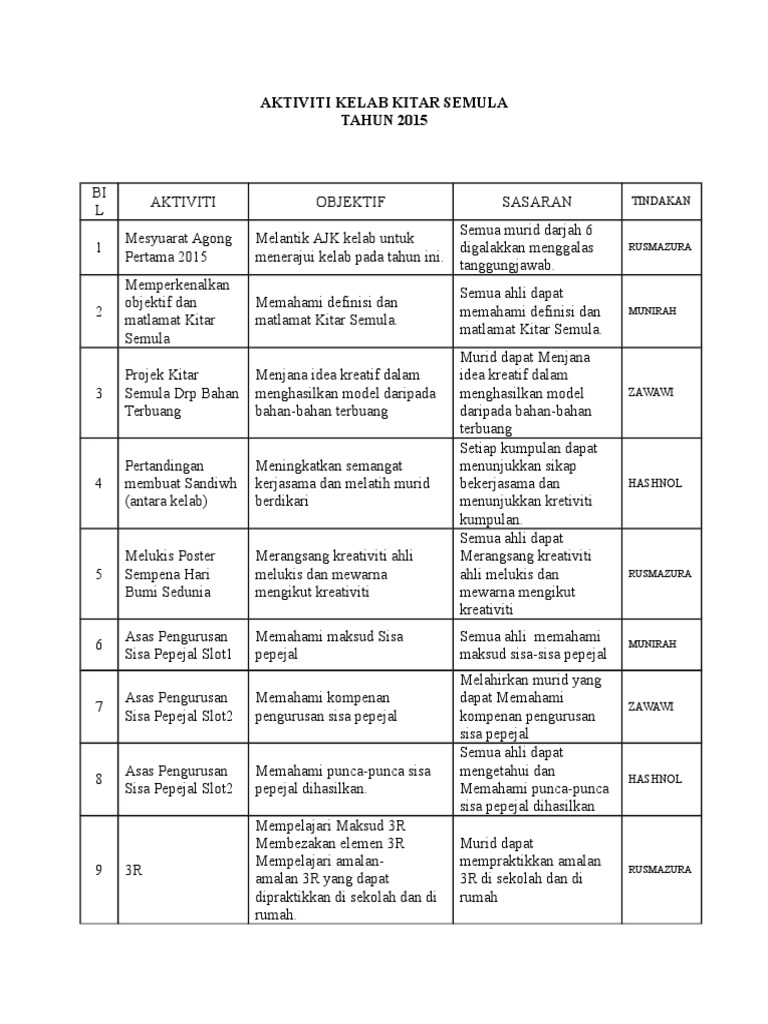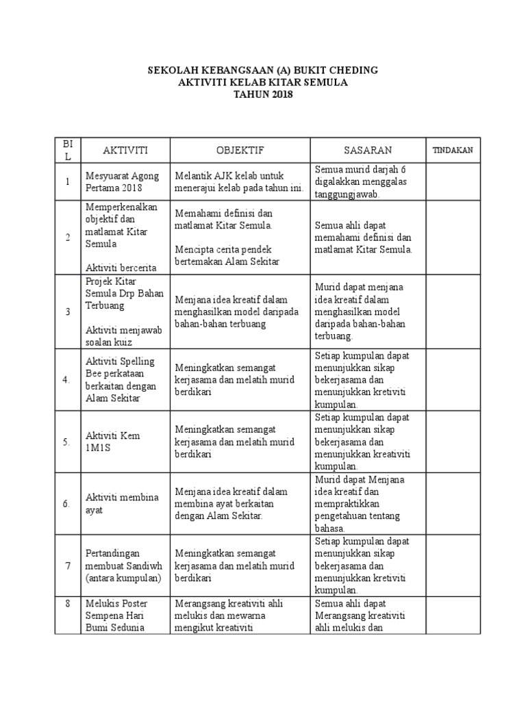 Sabtu 14 Agustus 2021. Objektif-Mewujudkan imaginasi murid berkenaan dengan Bumi yang. PERANCANGAN TAHUNAN KELAB ALAM SEKITAR PERJUMPAAN AKTIVITI BAHAN NILAI 1 Mesyuarat Agong -Perjumpaan pertama 2011 -Pemilihan AJK 2011 -Perbincangan aktiviti tahunan Buku Laporan Kelab Alam Sekitar Kepimpinan 2 Gotong-royong Membersihkan dan Menceriakan Kawasan Sekolah -Langkah mengatasi masalah pembakaran.